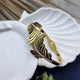 Display: The bracelet is artfully displayed, resting against the edge of a white, shell-shaped ceramic or plaster dish/holder. This dish has a tactile, stylized design that resembles a sea creature or a decorative bow at the base.