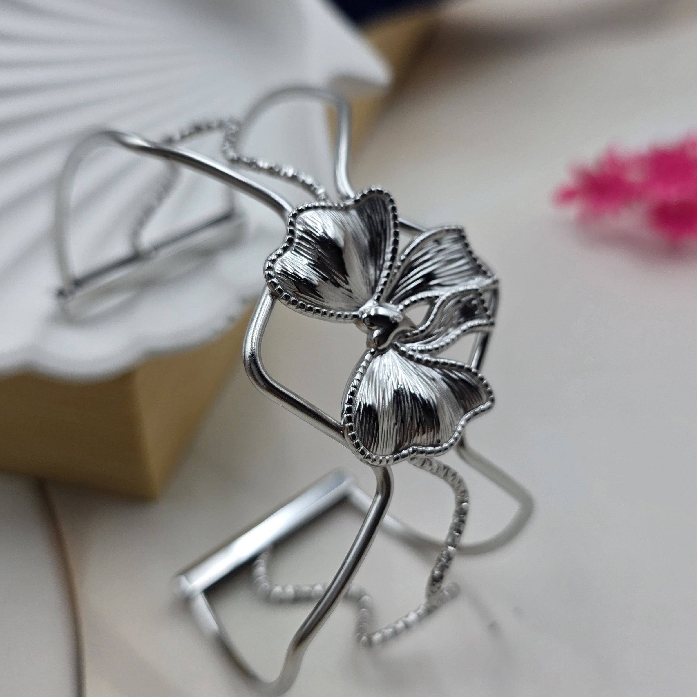 Design: The bracelet has an open, wide cuff design. Its most prominent feature is a large, stylized flower or bow motif centered on the front. This motif has a highly textured, ribbed, or striated surface, giving it depth and a realistic, almost folded appearance. The edges of the motif are outlined with small, bead-like details.