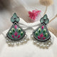 Main Drop: Suspended from the stud is the main body, which prominently features a large, faceted dark green stone (likely an imitation or semi-precious stone like an onyx, agate, or glass). This stone is surrounded by an intricate, rope-like or beaded metal border.