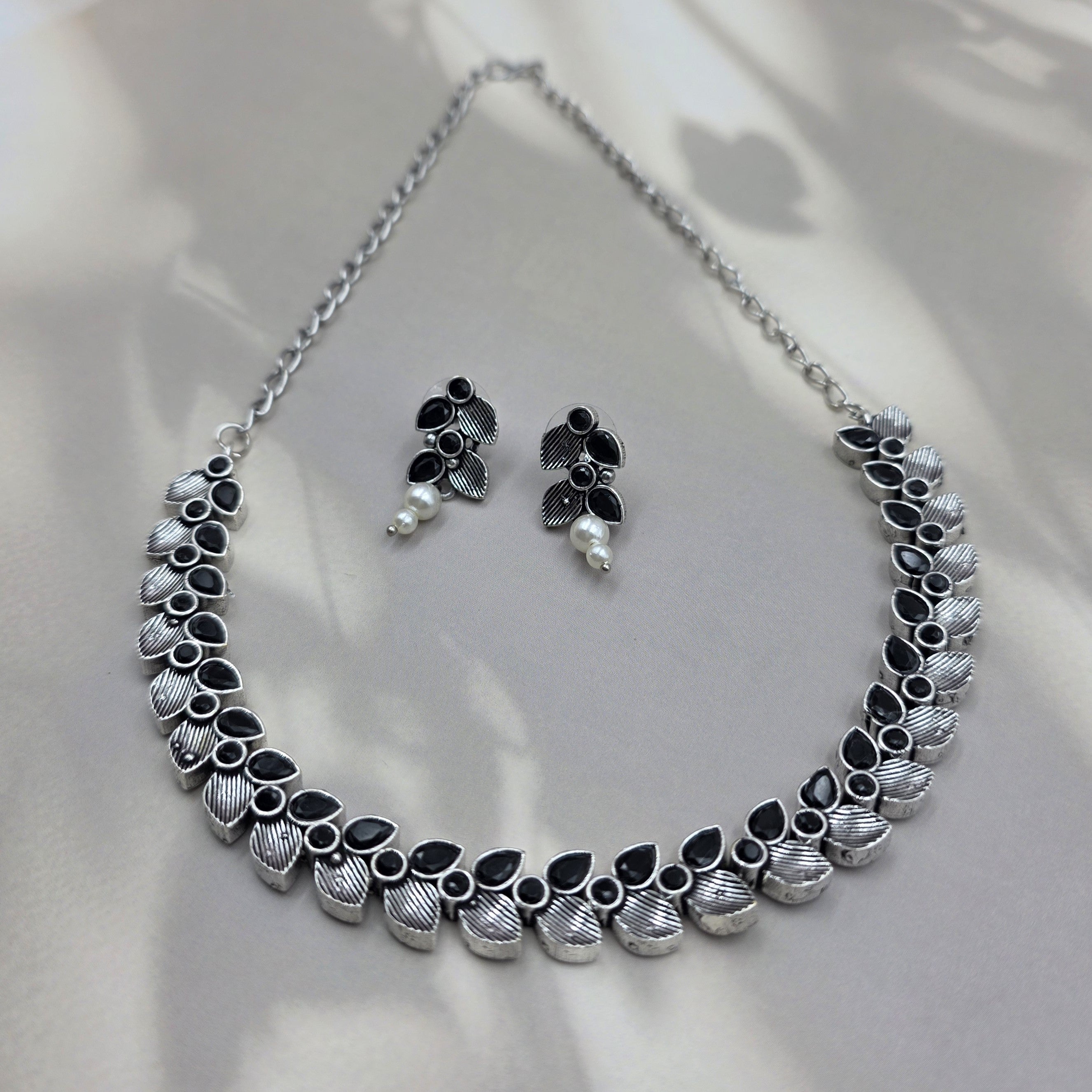 • Earrings: The earrings mirror the necklace's leaf motif, featuring a cluster of smaller metal leaves also set with black stones. They have a small pearl or white bead drop at the bottom for an added delicate touch.