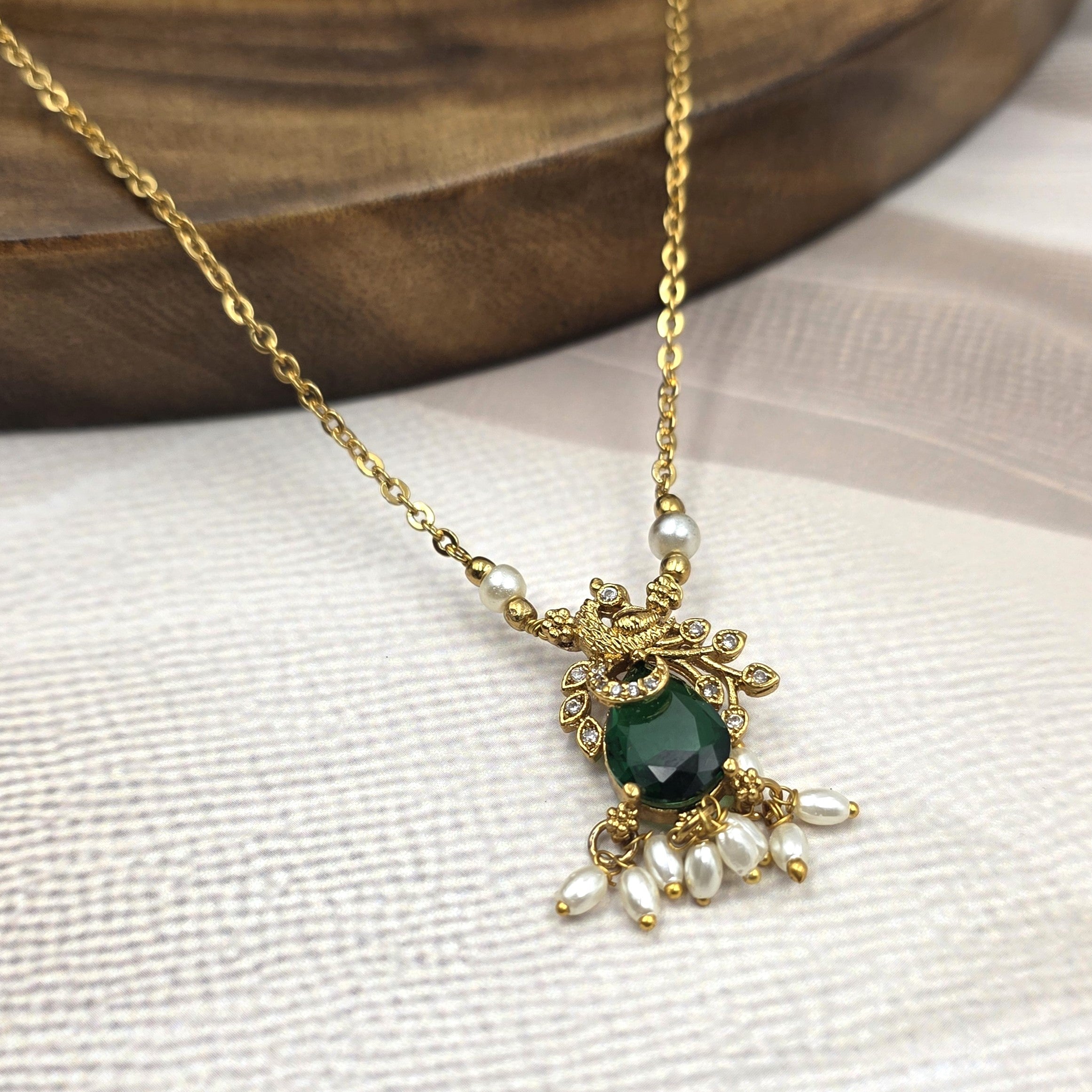 Pendant: The focal point is an intricate pendant centered around a large, deep emerald-green, pear-shaped or tear-drop gemstone.