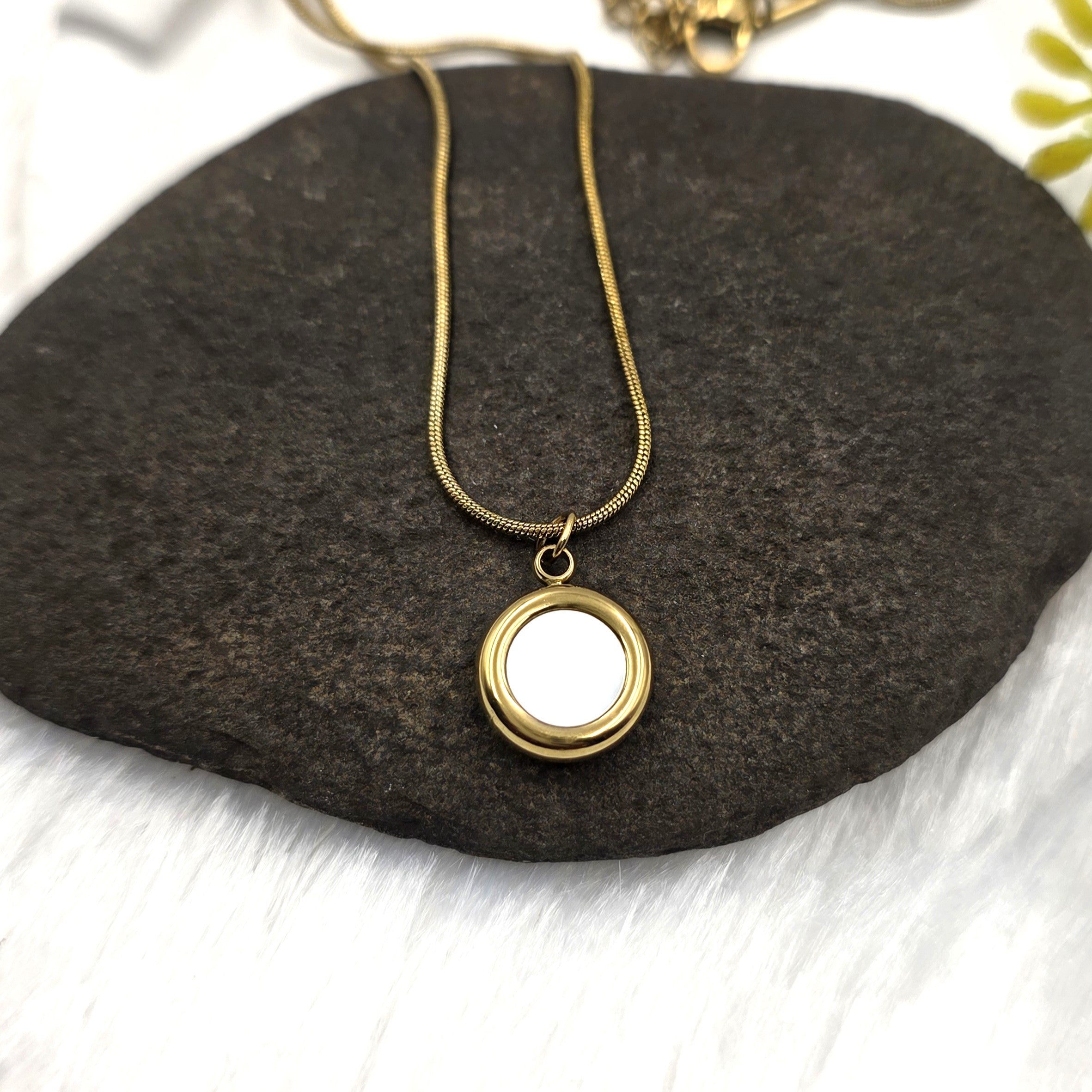 Pendant: A circular, bezel-set pendant with a white, smooth, opaque center insert. The gold-toned setting is simple and classic.