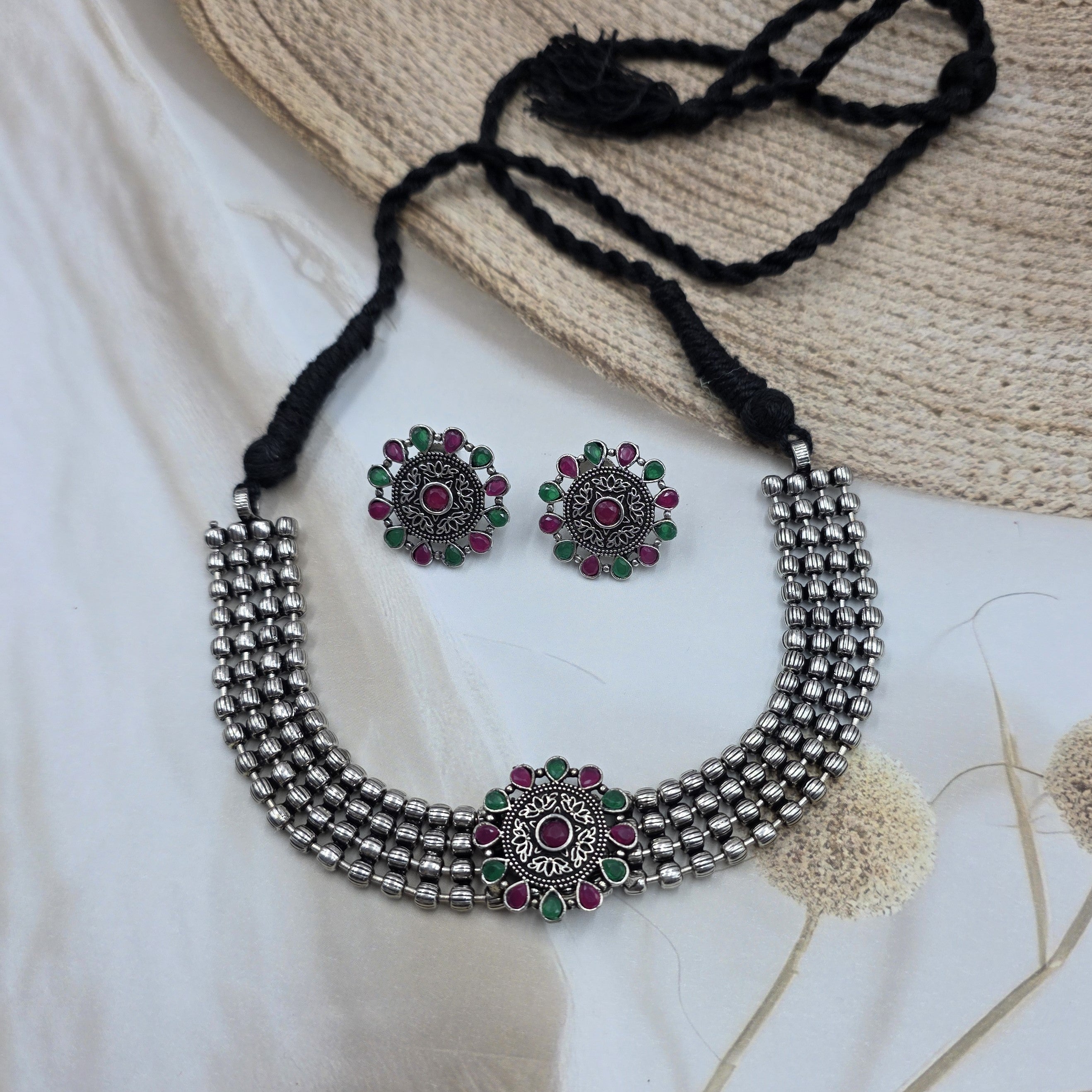 It features a central pendant/motif that is oxidized, circular, and decorated with a cluster of colorful, teardrop-shaped and round gemstones/kundan/glass stones. The central stone is a prominent royal blue one. The surrounding stones include shades like green, red/maroon, light blue, and pink.