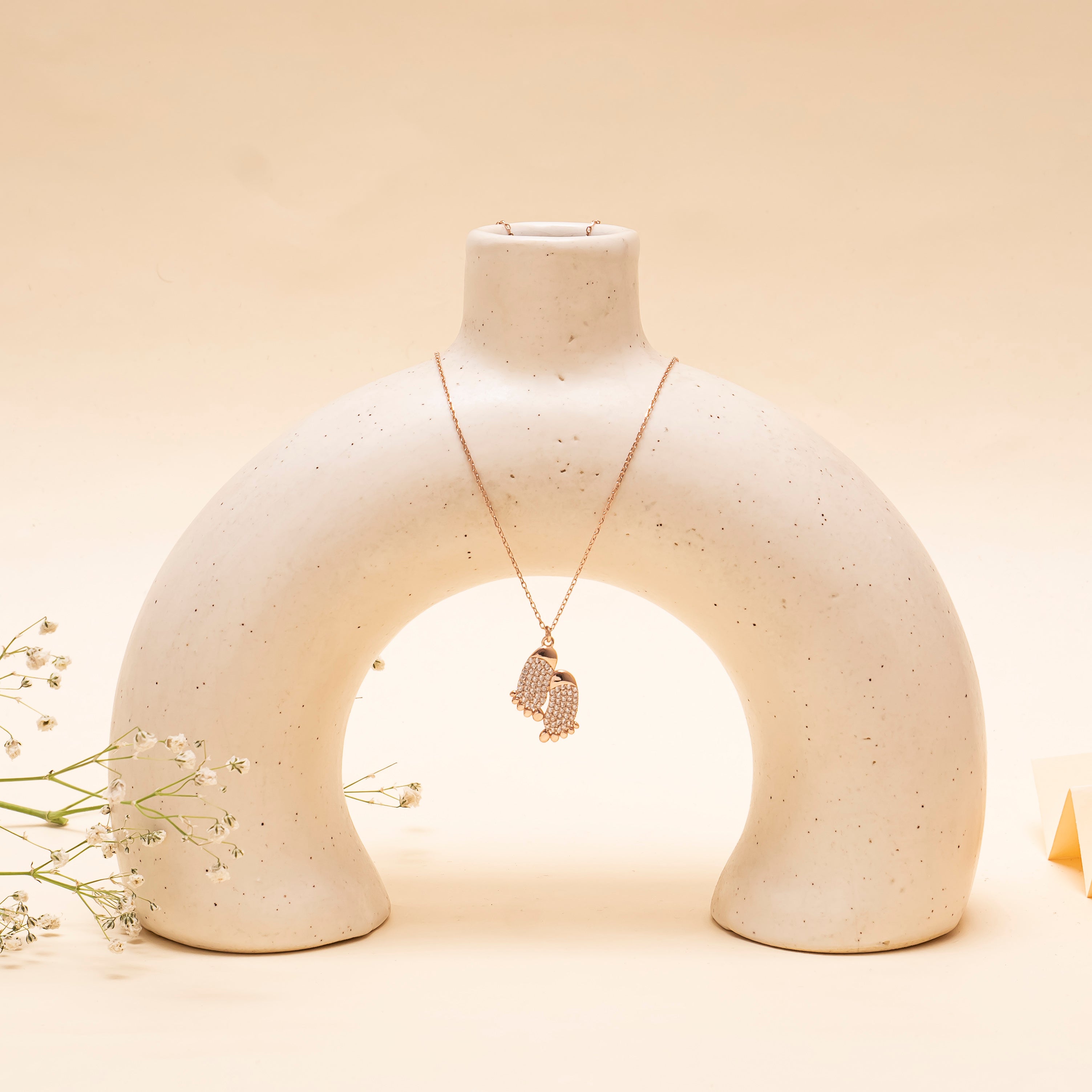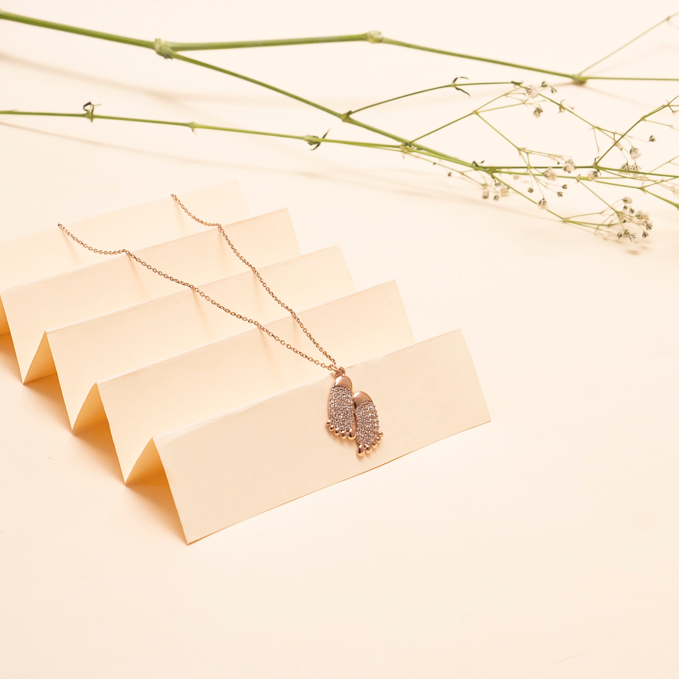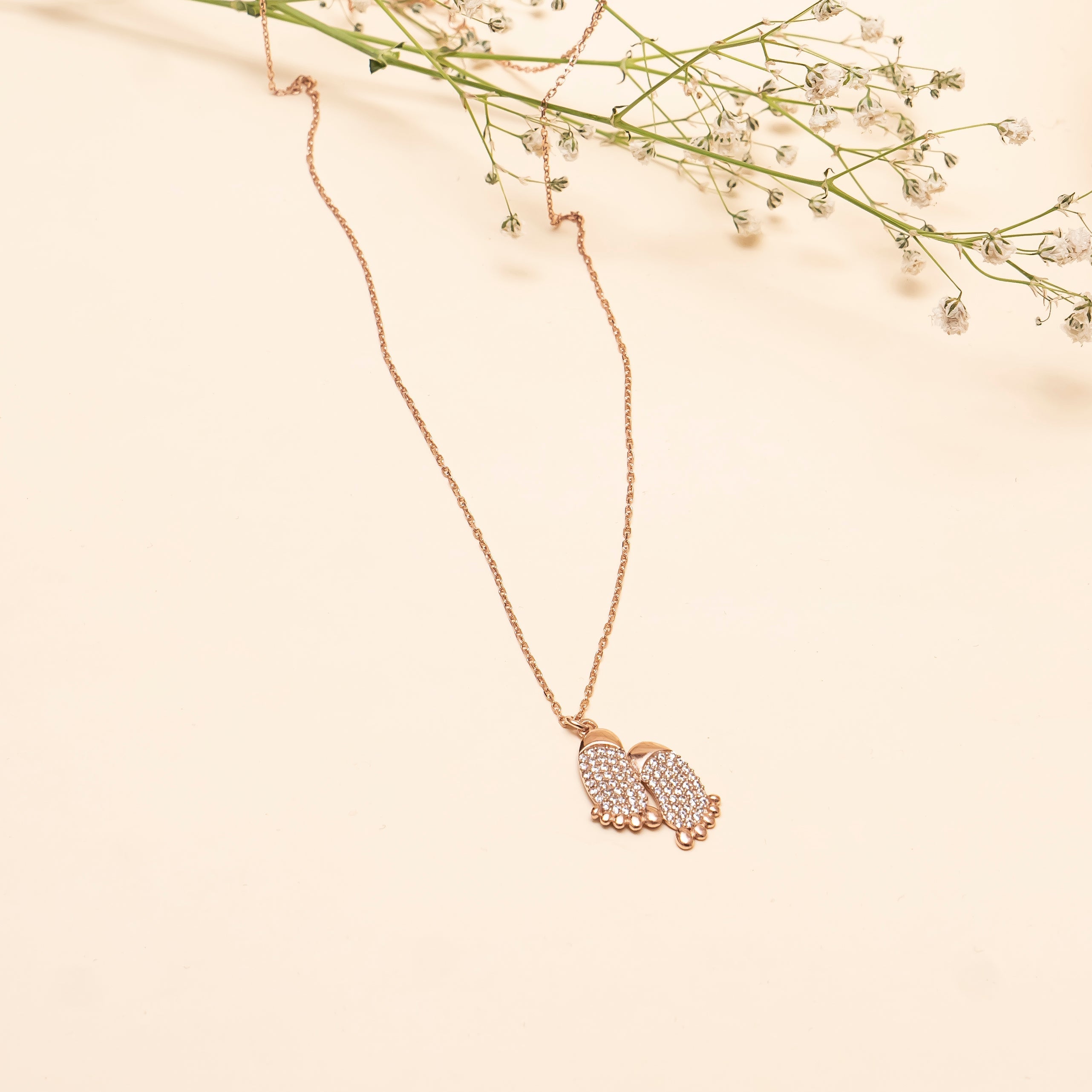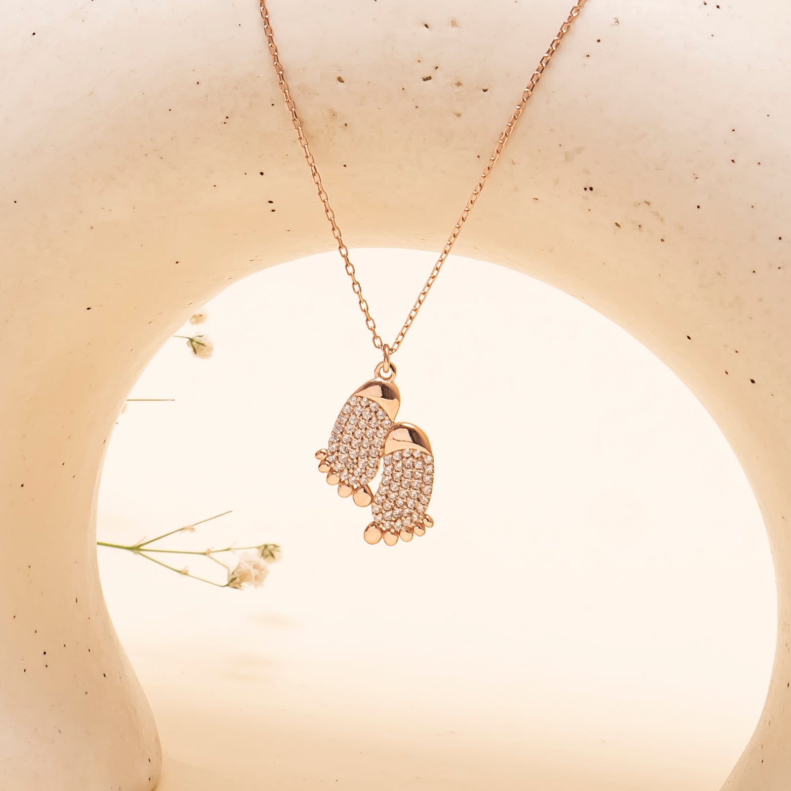 Product Details:This Baby Feet Necklace in 925 Silver is a sweet and sentimental piece that captures the joy of new beginnings. It features a delicate pendant shaped like tiny baby feet, encrusted with shimmering zircon stones for added elegance. Suspended on a fine rose gold-toned chain, it's both heartwarming and stylish. A perfect gift for baby showers, new moms, or commemorating the birth of a child.