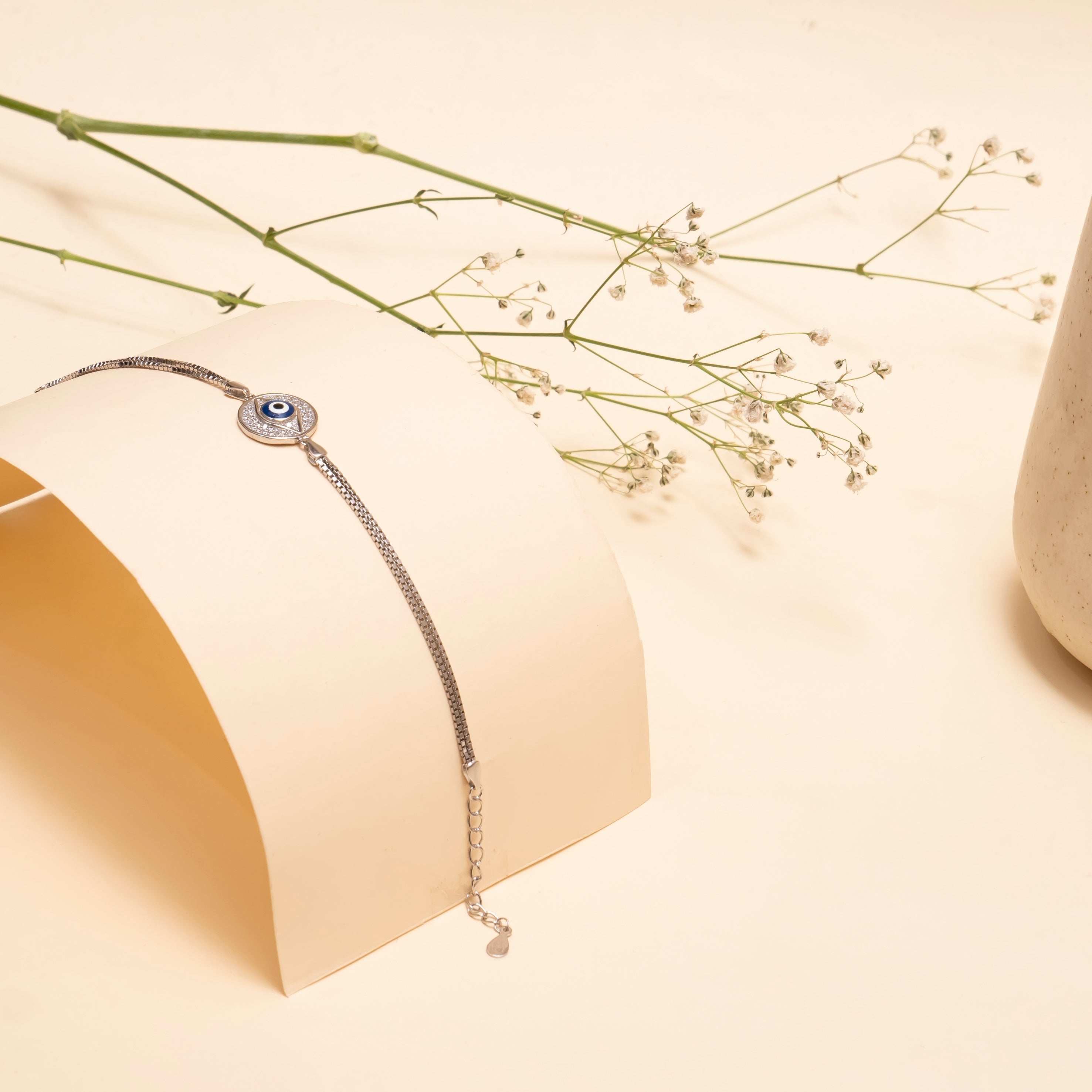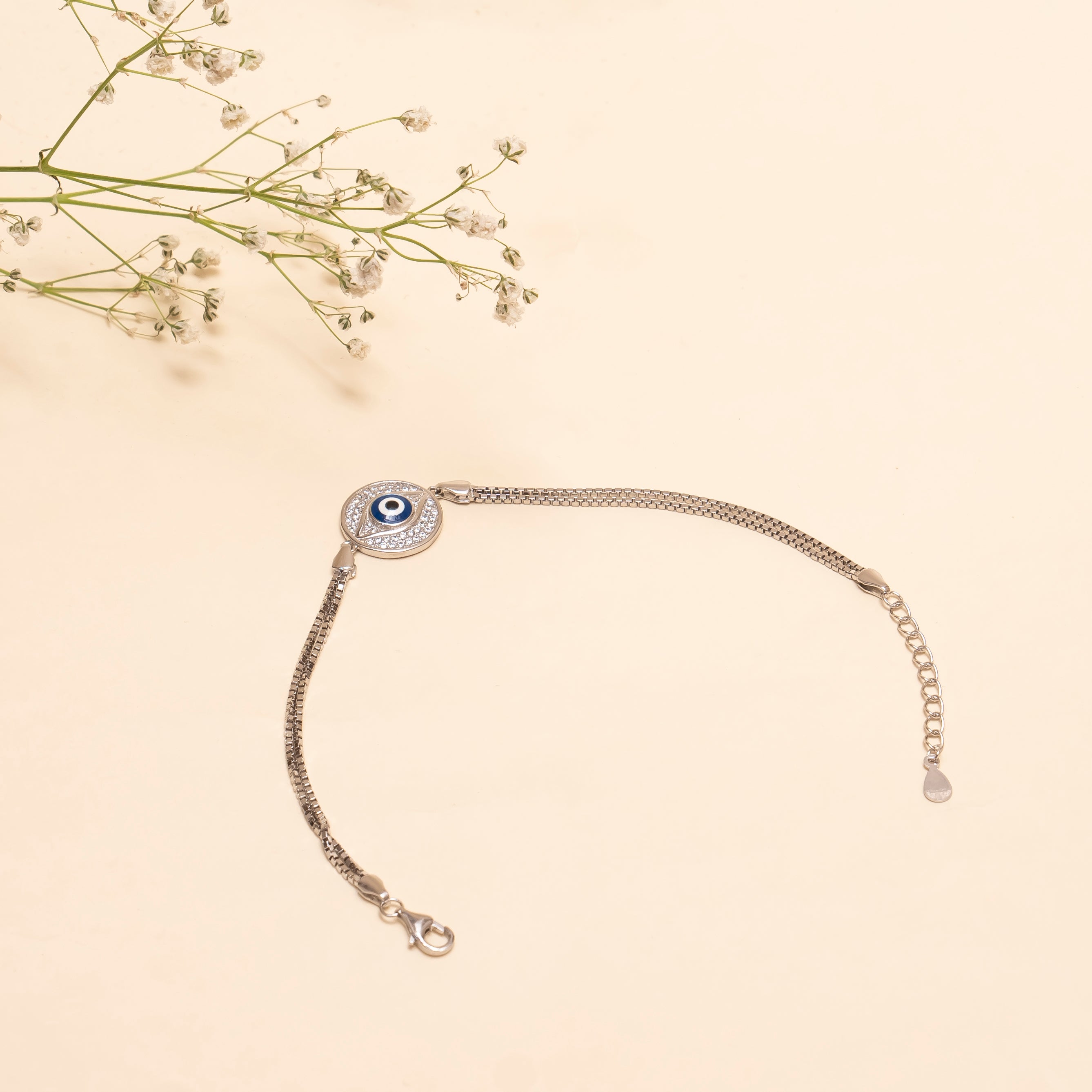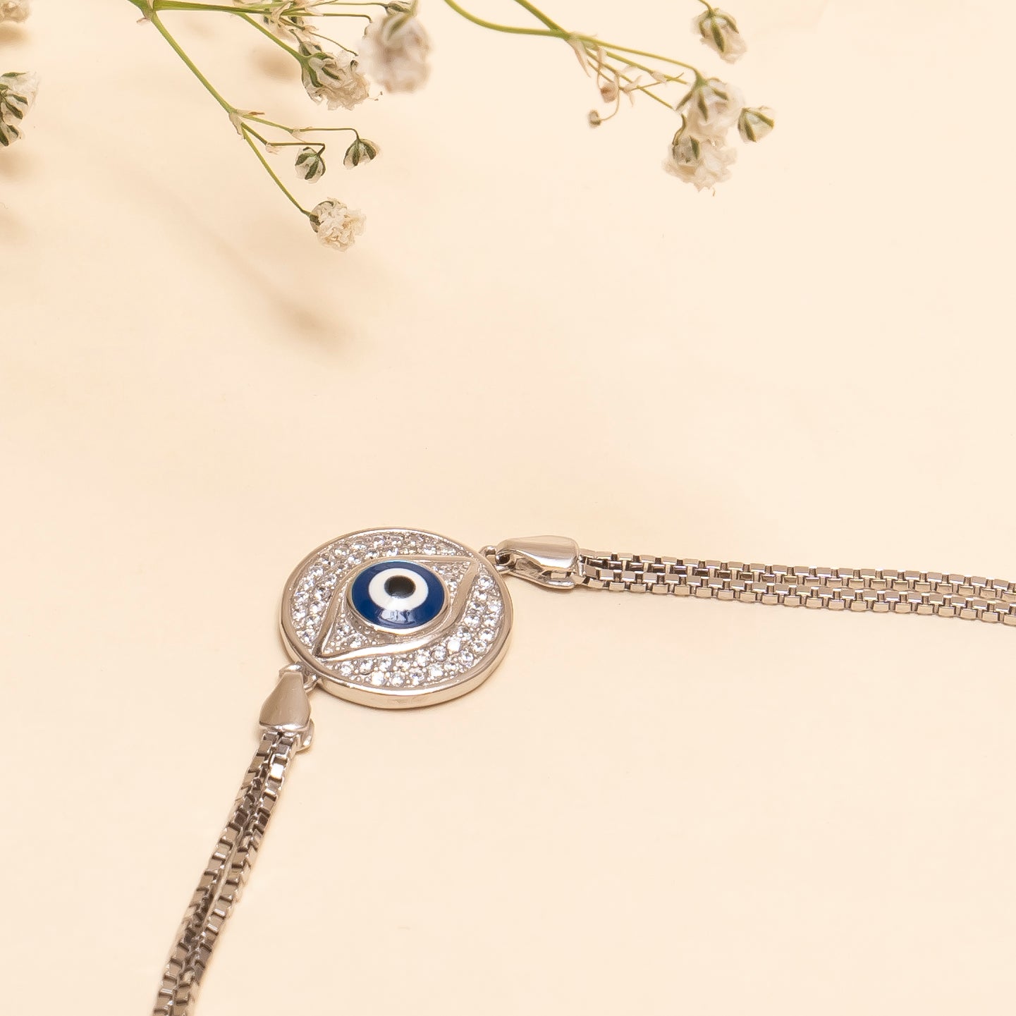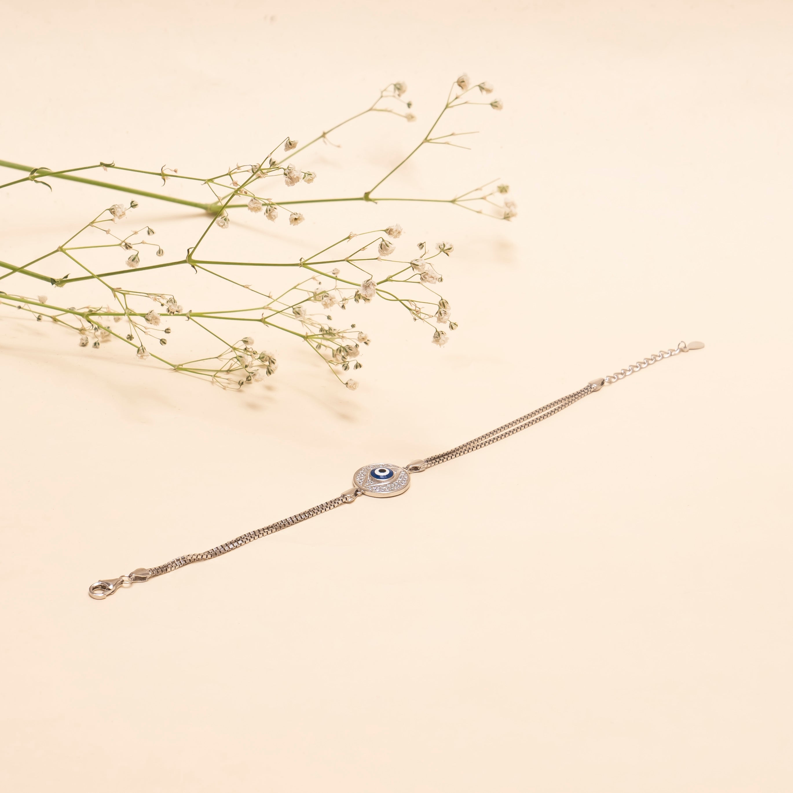 Design:A sturdy dual-chain bracelet with a circular evil eye centerpiece surrounded by dazzling stones.