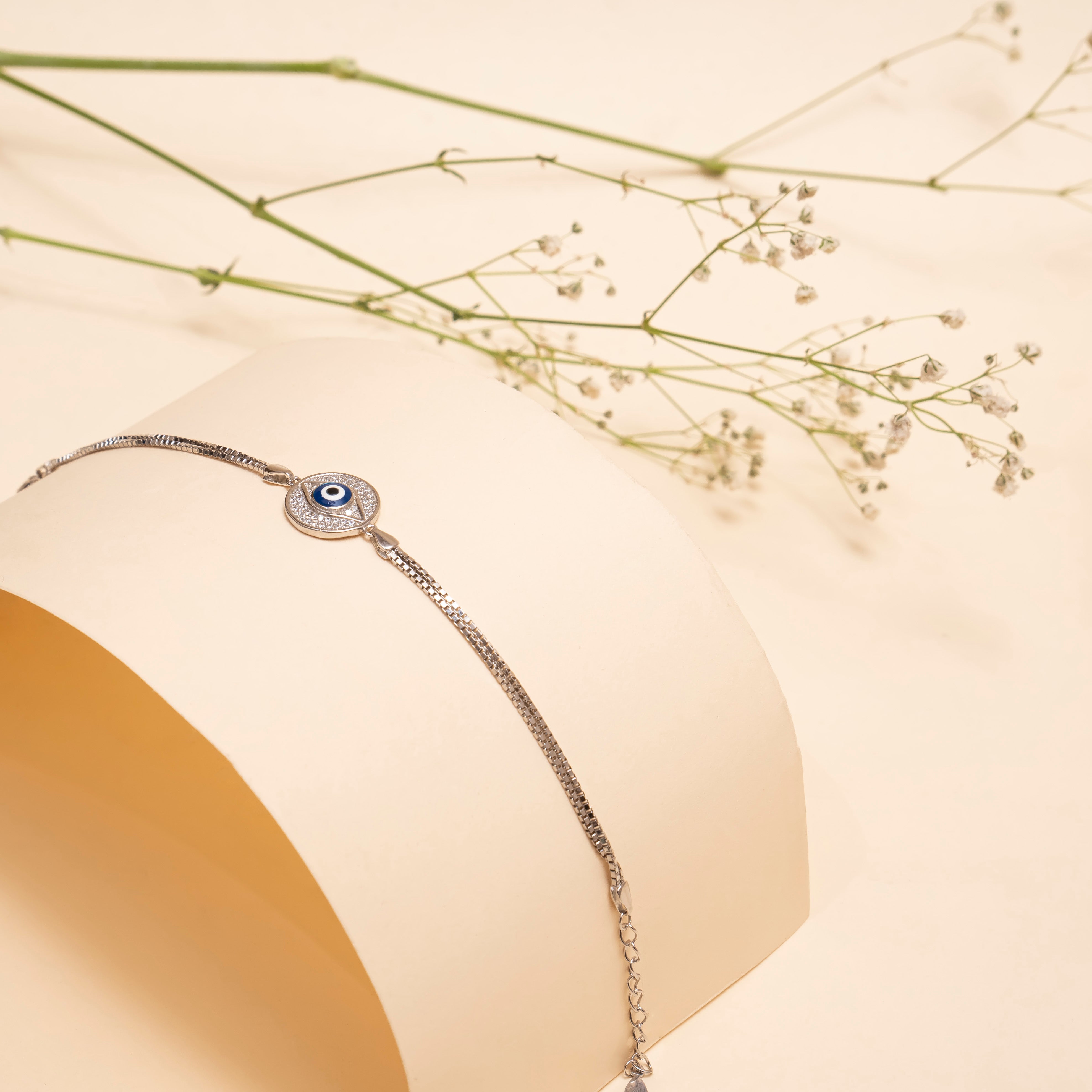Product Details:This Evil Eye Bracelet offers a bold yet elegant way to carry protection and positivity with you. Centered with a striking evil eye charm framed by sparkling stones, it captures instant attention. The bracelet’s dual-chain style gives it a modern, sophisticated touch suitable for any look. A perfect blend of meaningful symbolism and timeless fashion.
