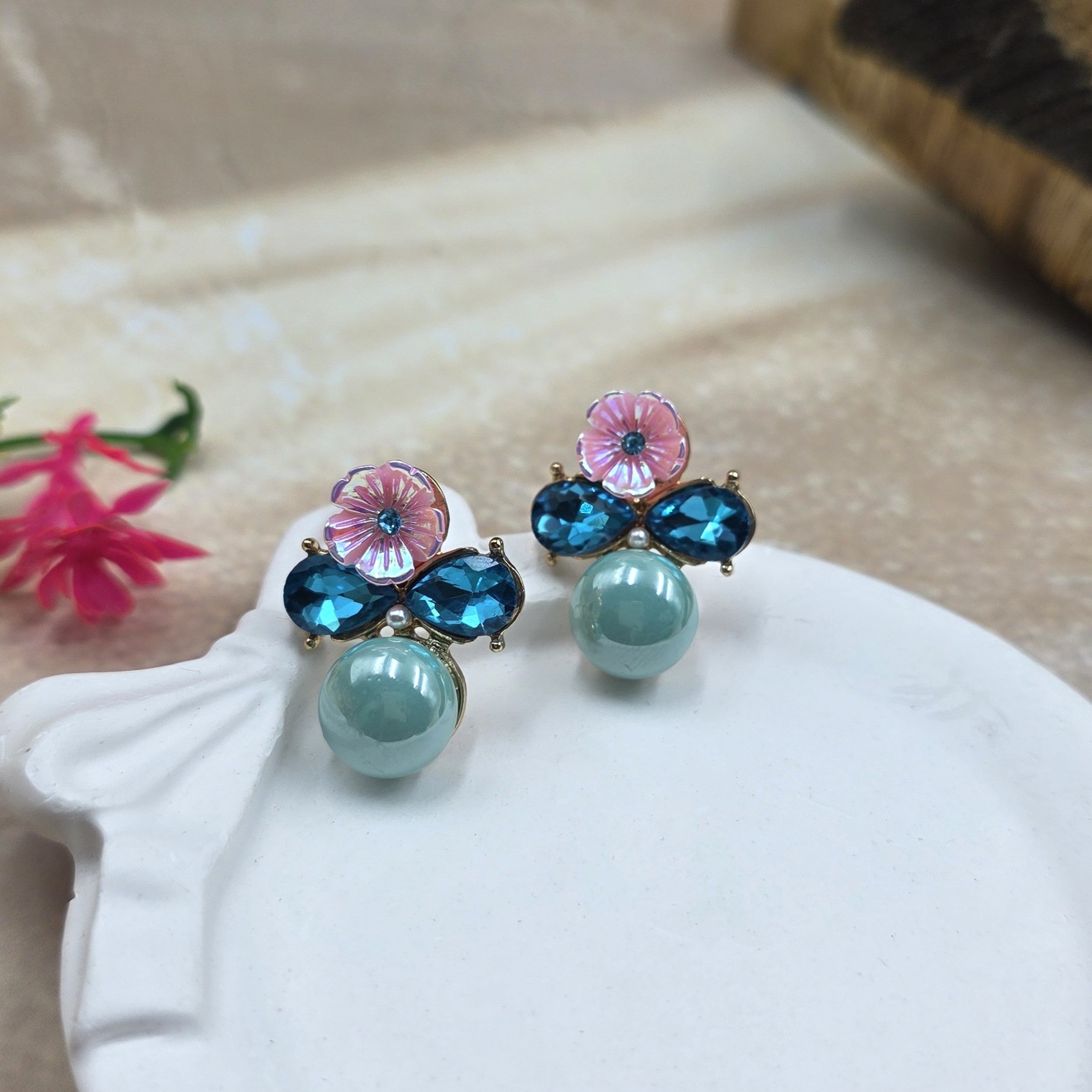 Top Element: The focal point is a small, iridescent pink flower or enamel piece at the earlobe.