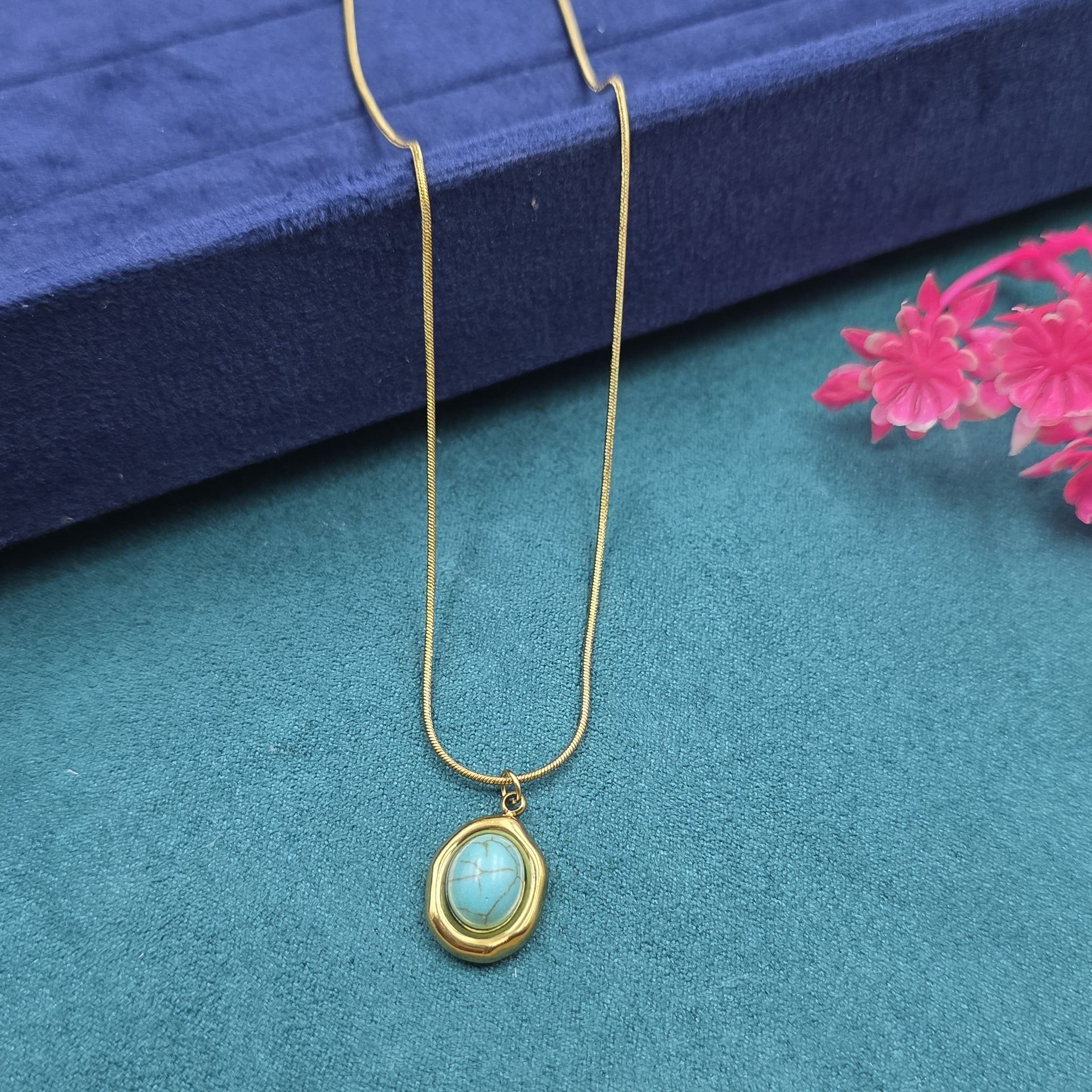 Pendant Setting: The turquoise piece is set within a gold-toned metal bezel that has an slightly uneven, organic shape.