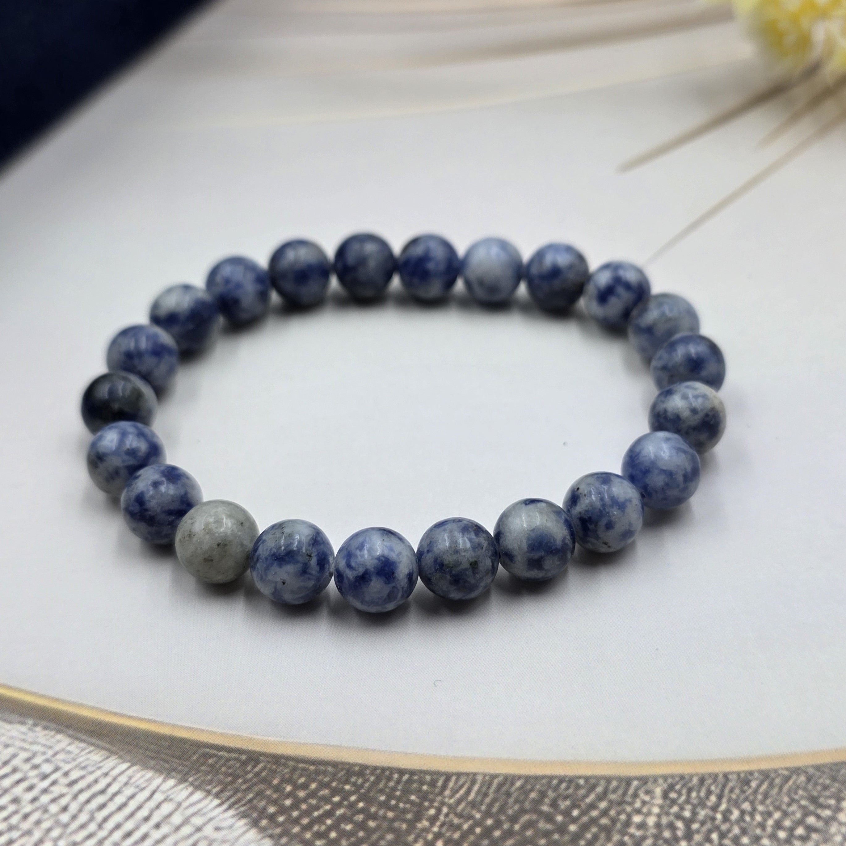Material (Likely): The beads appear to be a type of natural stone with a distinct coloration. The deep blue color marbled or speckled with white, gray, or lighter blue inclusions strongly suggests this stone is Sodalite or possibly Lapis Lazuli (though Sodalite is a closer match for the specific pattern).
