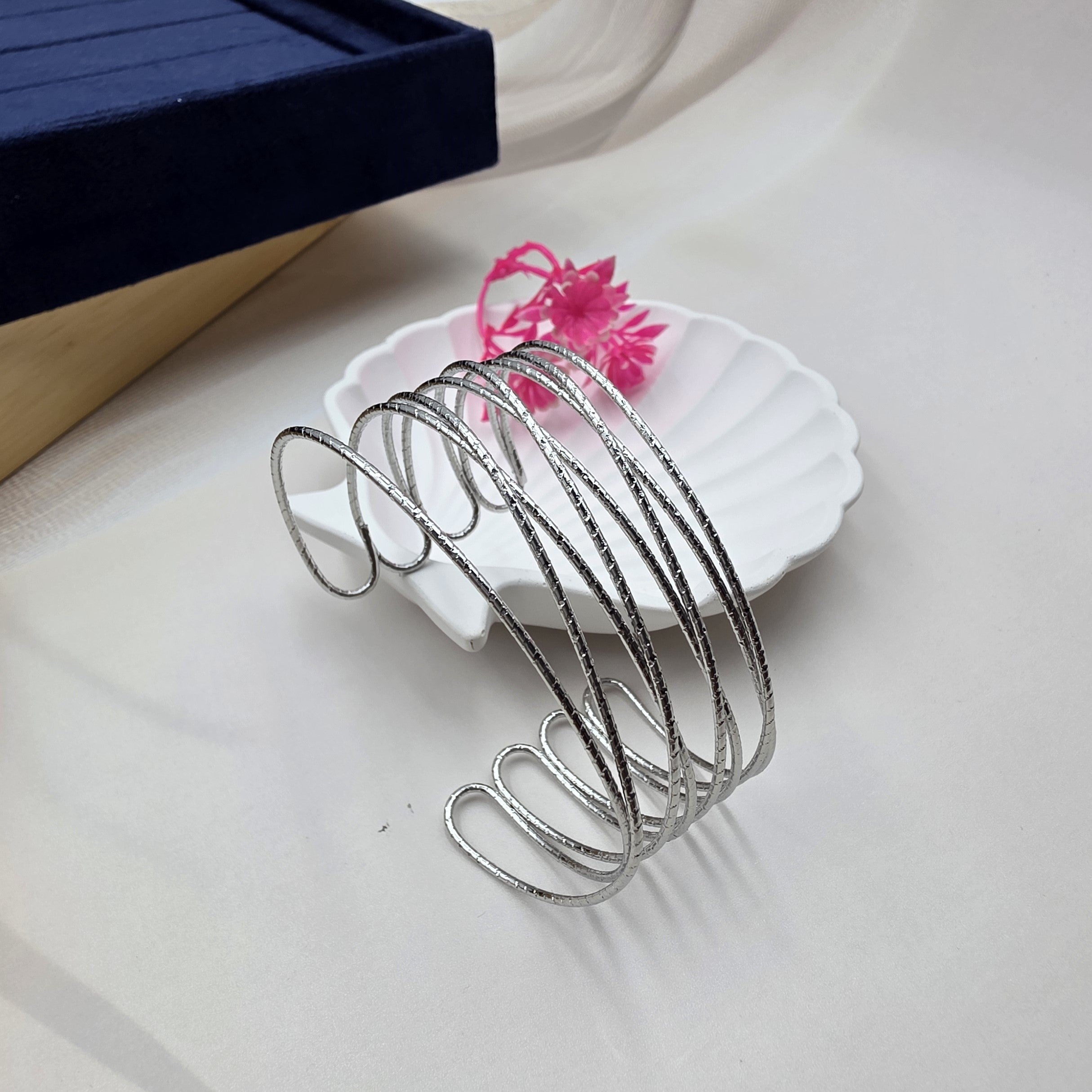 Design: The cuff is composed of multiple, thin bands that are connected at the ends and appear to wrap around the wrist together. The bands have a slightly undulating or wavy form.